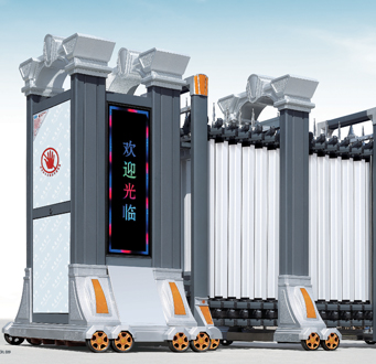 4.電動(dòng)伸縮門體有LED彩燈,靜態(tài)顯示屏字樣,全遙控。